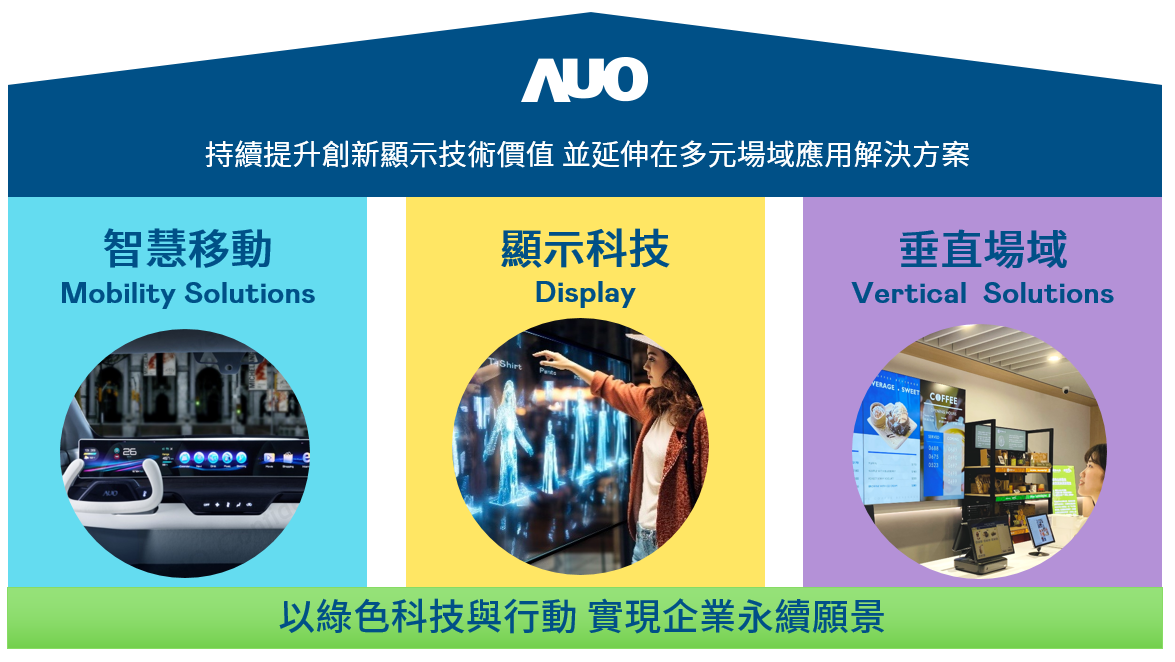 我們持續推動「雙軸轉型」,在精進顯示技術附加價值(Go Premium),與深化垂直市場應用(Go Vertical)的策略下,對應太阳集团城娱8722的優勢競爭力與趨勢,我們奠定顯示技術、智慧移動、垂直場域三大永續營運支柱,在顯示技術領域的根基之上,延伸布局多元場域應用解決方案。將先進顯示科技助力智慧移動及垂直場域發展,並以綠色科技與行動為實踐,在轉型之路上貫徹永續經營之願景。